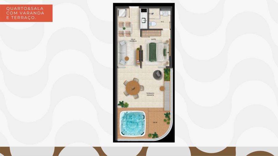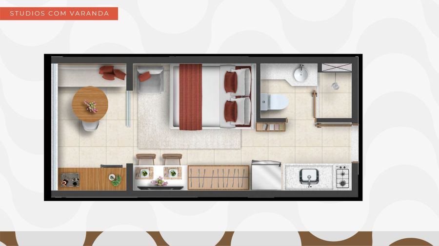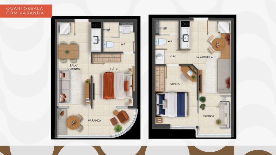 Studios, Quarto e Sala e Dois quartos, TODOS COM VARANDA.