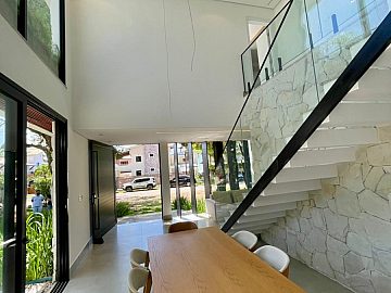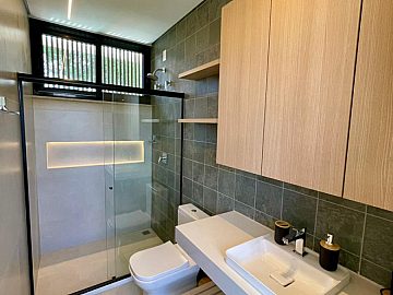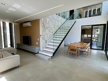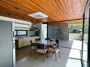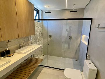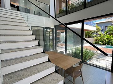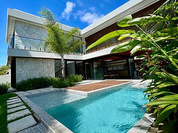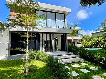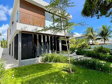 Casa alto padrão em condomínio com acesso a praia, lote de esquina, nascente, pé direito alto, com SISTEMA FOTOVOLTAICO e aquecimento de água, climatizada (K7), 05 suítes, sendo 01 master com closet, piscina com cascata, prainha e hidromassagem, apenas 200 metros da praia, disponível para venda.