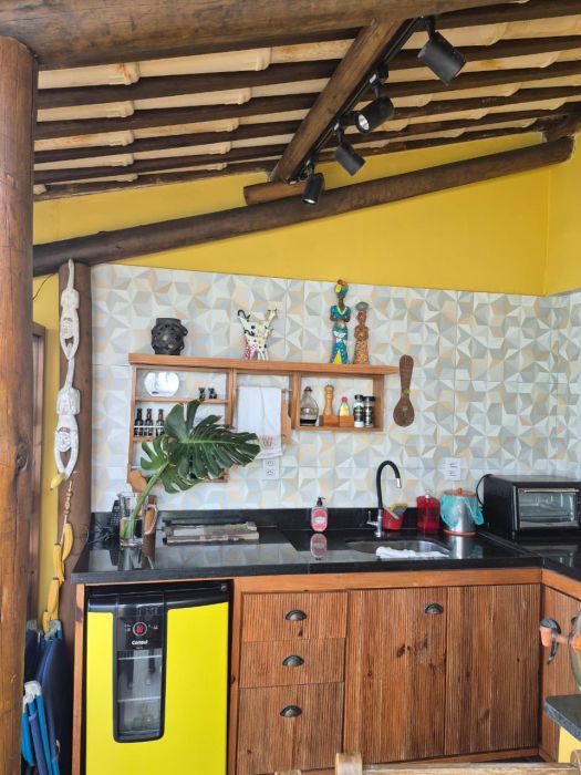 Parte superior com sala, 01 suíte, espaço gourmet com chuveirão e área coberta com churrasqueira.