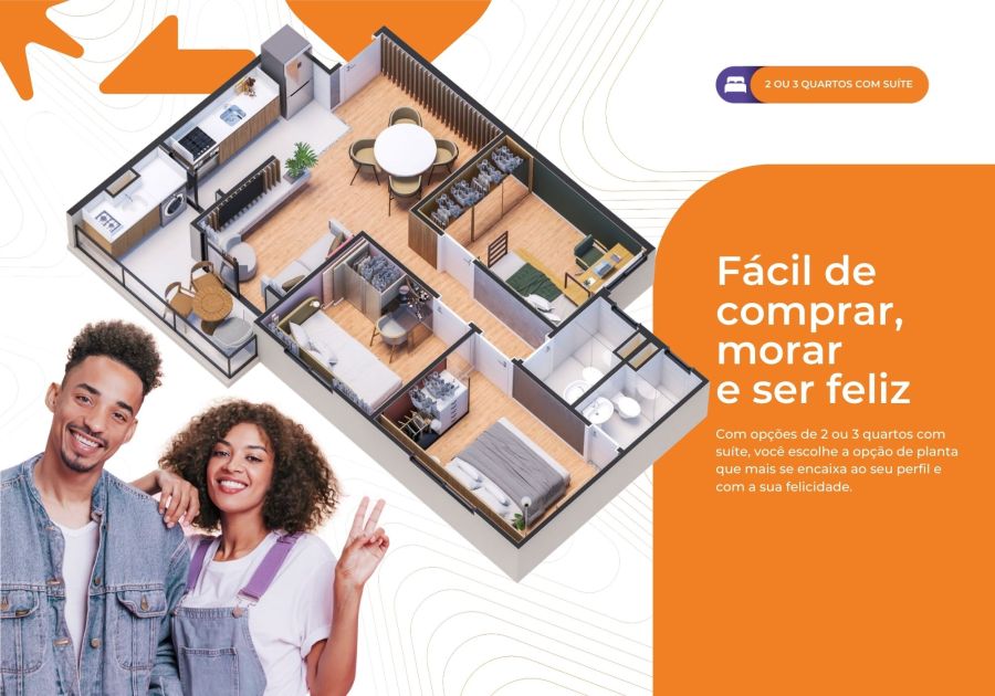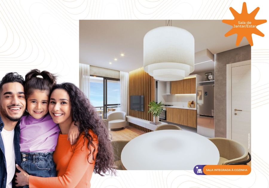 2 ou 3 quartos com suíte; Cozinha integrada à sala e a varanda; Área de lazer completa e equipada; ITIV e cartório grátis.