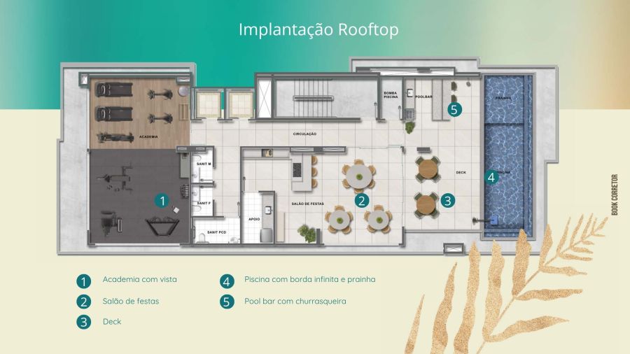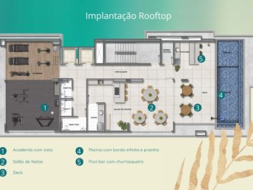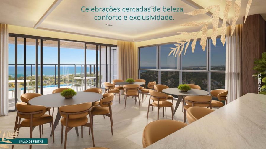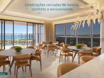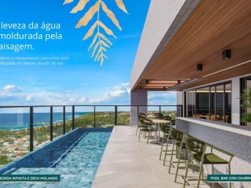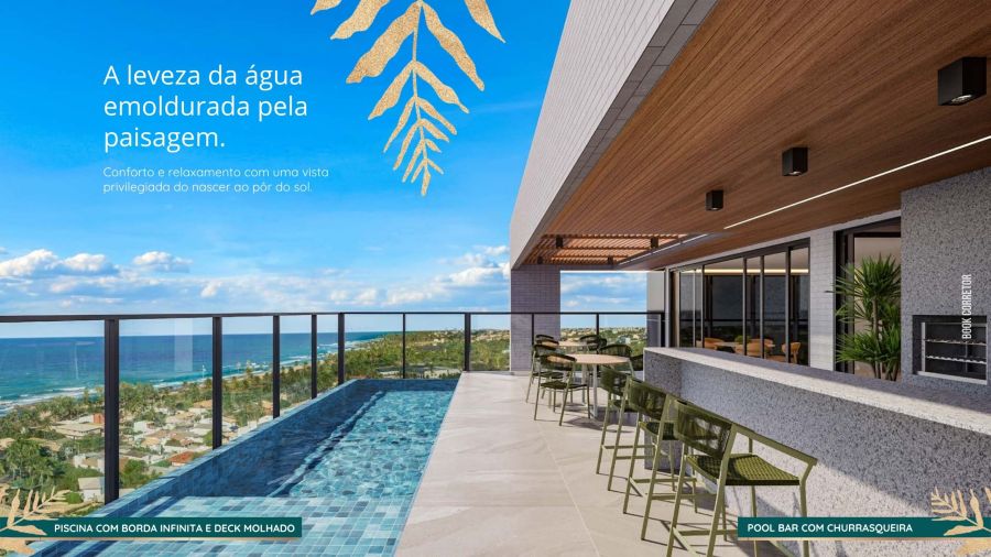 Rooftop com piscina de borda infinita e vista panorâmica para o mar, academia, salão de festas com pool bar e churrasqueira, além de um inspirador coworking com salas de reunião.